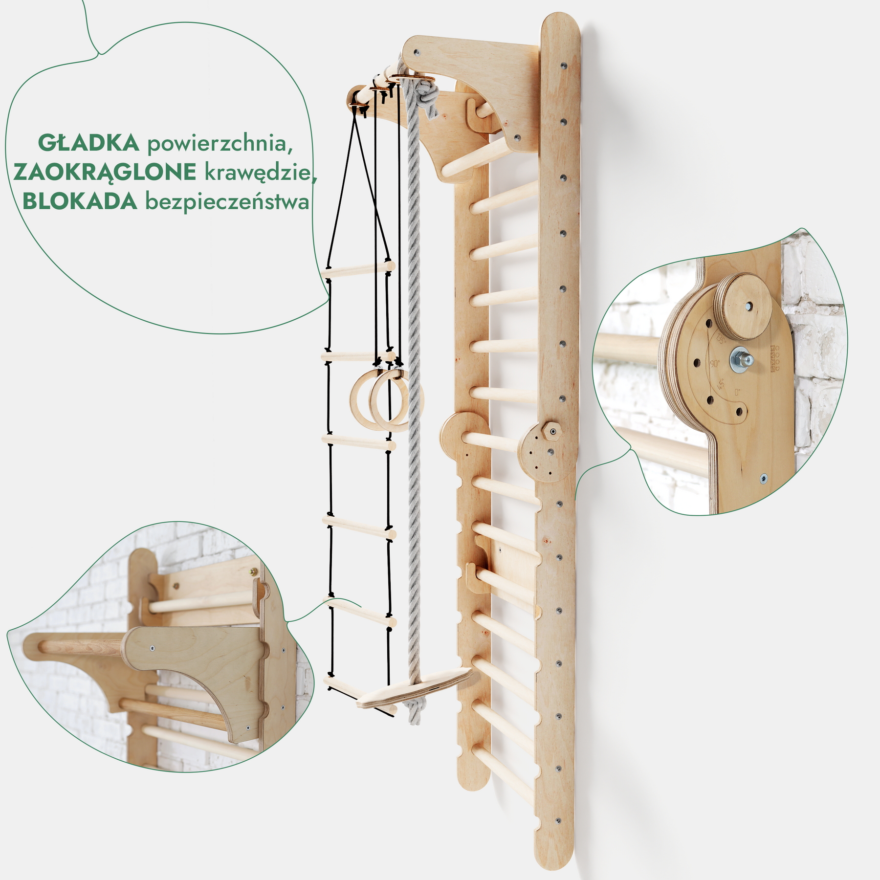 Wszechstronny design pozwala na łatwą przemianę ścianki w trójkąt Piklera ze zjeżdżalnią, oferując jeszcze więcej możliwości ruchu i zabawy. Zestaw zawiera także trzy różne huśtawki, które urozmaicają zabawę i dodają frajdy. Ściana szwedzka Goodevas to coś więcej niż zabawa — to rozwój, bezpieczeństwo i trwała jakość.