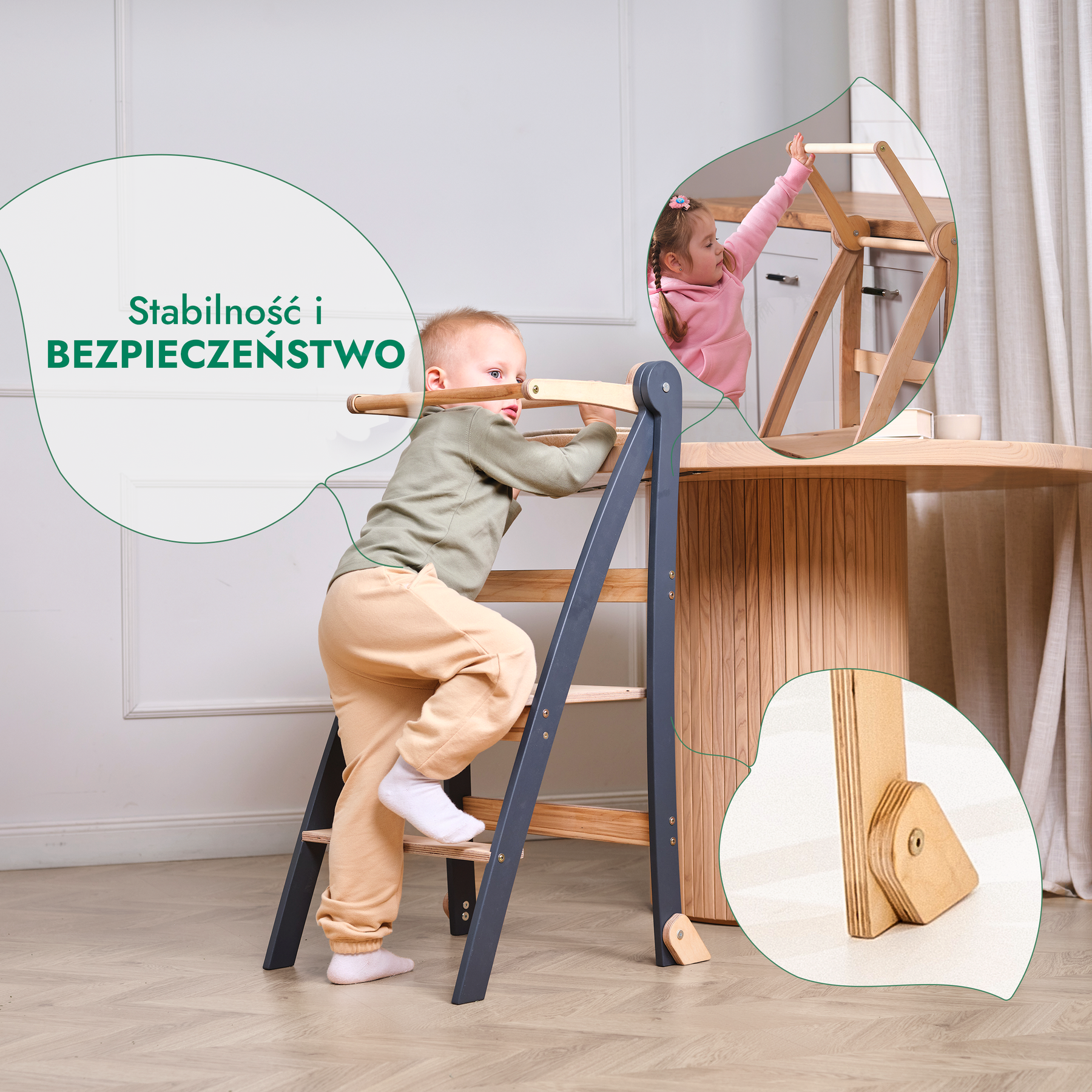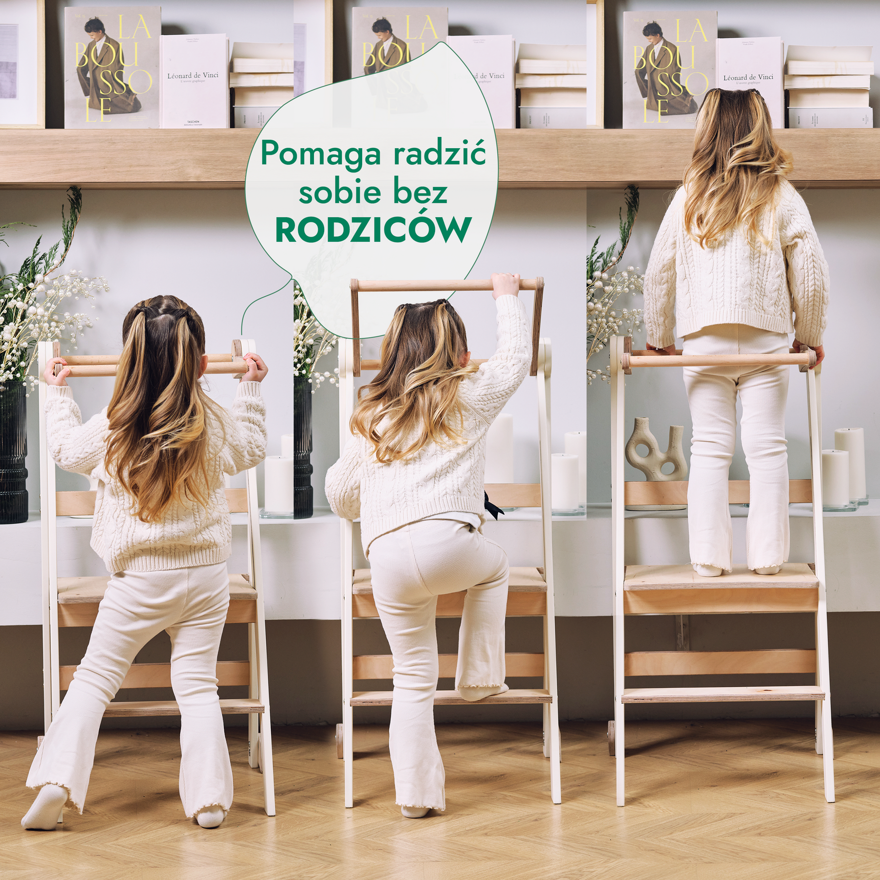Pozwól swojemu maluchowi odkrywać, uczyć się i rozwijać z pewnością siebie! Od mieszania i zagniatania ciasta, przez krojenie, siekanie, przelewanie, a nawet mycie zębów czy naczyń — codzienne czynności stają się zabawne i edukacyjne dzięki wsparciu naszej składanej wieży dla maluchów.