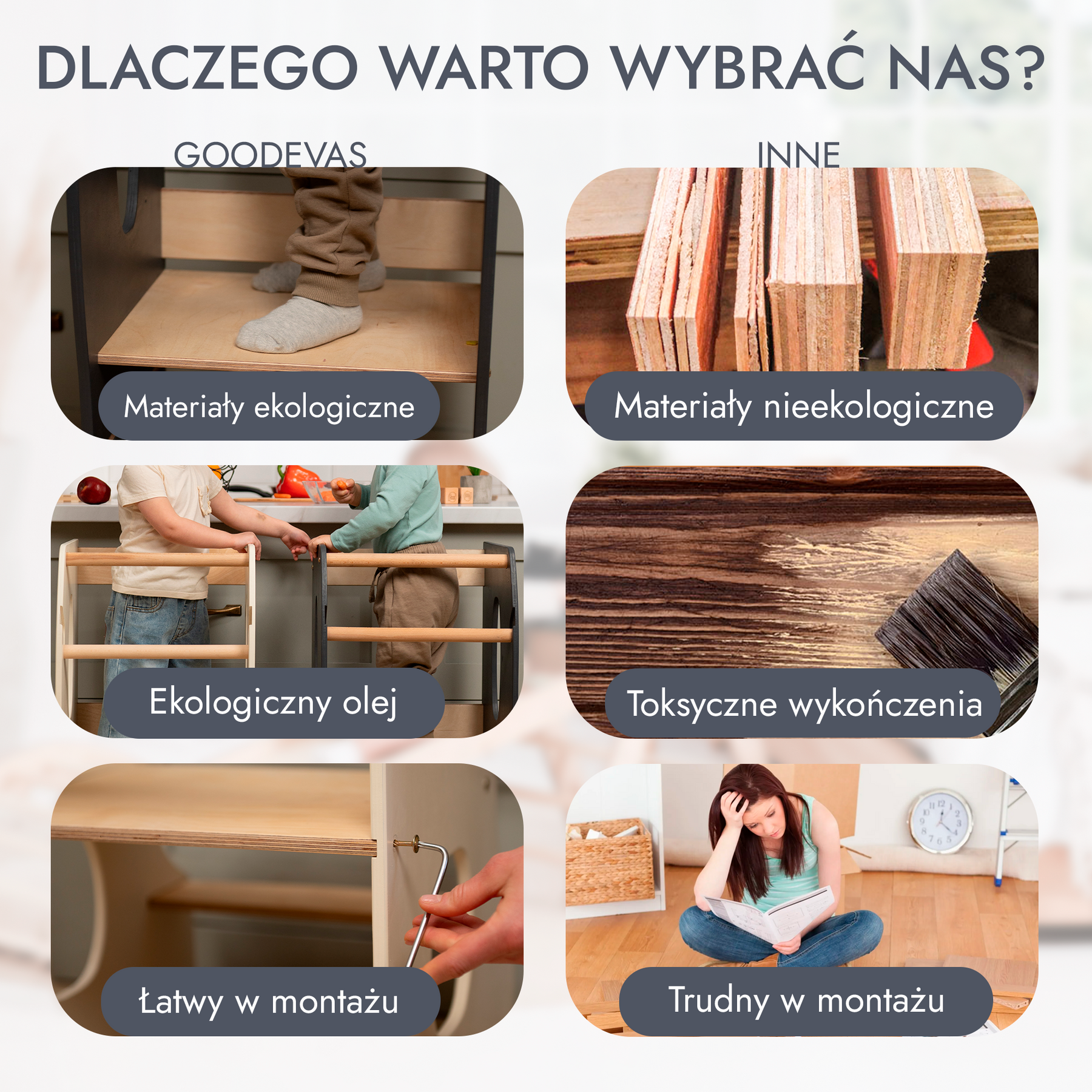 Nasz podest kuchenny Montessori to idealne rozwiązanie dla dzieci w wieku od 1 do 7 lat. Pozwala im aktywnie uczestniczyć w codziennych czynnościach rodzinny. Dzięki niemu Twój maluch może pomagać w kuchni, samodzielnie myć ręce przy zlewie, sprzątać razem z Tobą i wykonywać inne zadania, które wcześniej były dla niego niedostępne.